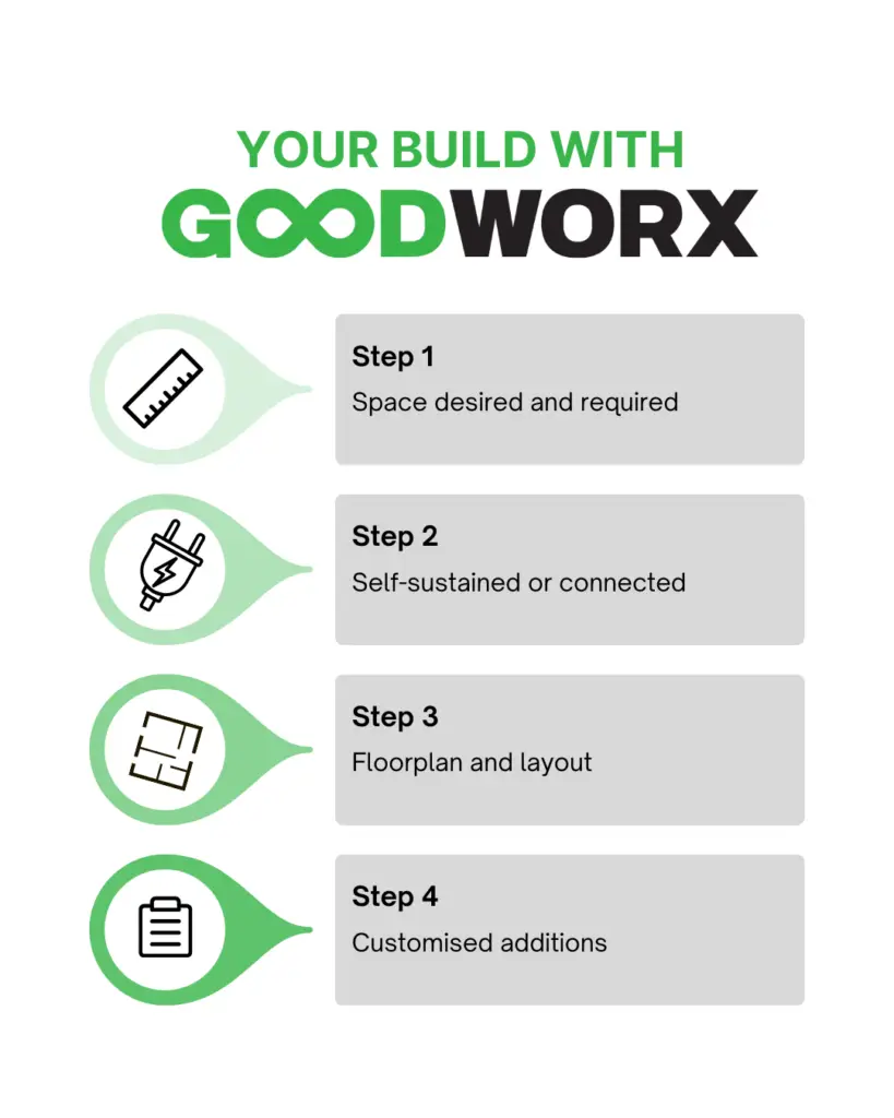Each GOODWORX building can be designed for complete connection, partial connection, or fully self-sustained/ off-grid with minimal environmental impact. Experience elevated comfort and practical ease through innovative, sustainable and adaptive design features.